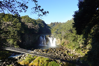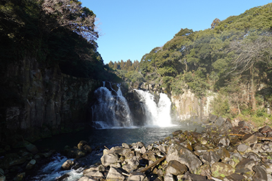 溶岩が冷え固まるときにできた柱状節理を流れ落ちる丸尾滝